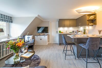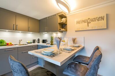 Die Ferienwohnung 'Eppendorf' befindet sich im 1. Obergeschoss, sie verfügt über ein Wohn- und Esszimmer mit integrierter Küche mit Esstheke. Es gibt ein separates Schlafzimmer mit zwei Einzelbetten und ein helles Duschbad. Für eine dritte Person kann am Abend die Schlafcouch im Wohnzimmer ausgezogen werden (siehe letztes Foto der Innenaufnahmen).