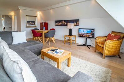 Der schöne Wohnraum mit Ausblick zur Uwe Düne und die kleine Küche befinden sich auf einer Ebene. Im Dachgeschoss dieser Wohnung finden Sie ein schönes Schlafzimmer mit Doppelbett, bei dem Sie beim Träumen den Sternenhimmel sehen können, ein absolutes Erlebnis! Das helle Bad liegt ebenfalls im oberen Bereich. Im Wohnzimmer gibt es zusätzlich eine tolle Schlafcouch, die bei Bedarf Platz für eine dritte Person bietet.